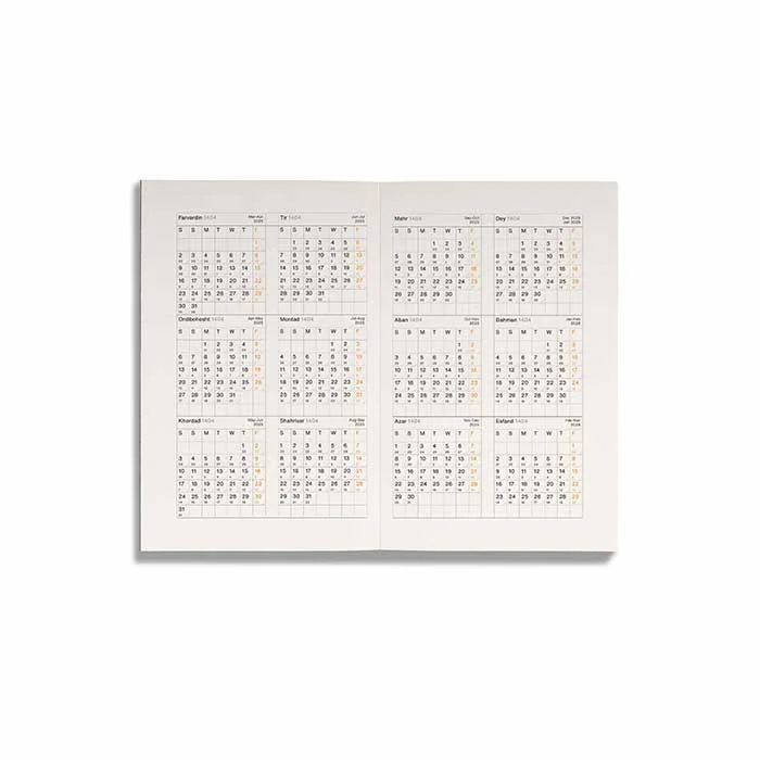 دفتر سالنمای ۱۸ ماههٔ بُن تاریخدار است، از مهر سال ۱۴۰۳ آغاز میشود و تا پایان سال بعد ادامه دارد.