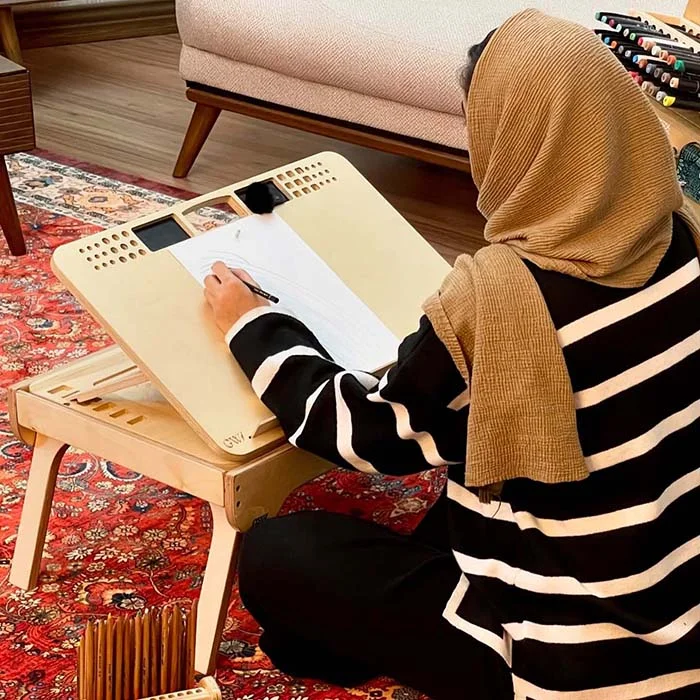 بهترین مکمل برای میز شیبدار! این محصول مخصوص آن دسته از افرادی است که از قبل میز شیبدار خریداری کرده اند و بیشتر اوقات روی زمین و به صورت نشسته کار میکنند! با قرار دادن این پایه در قسمت زیرین میز شیبدار، فضایی ایده آل برای فعالیت طولانی مدت بدون احساس خستگی فراهم می شود. این محصول به صورت اختصاصی برای میز شیبدار A3 طراحی شده و برای استفاده از آن، نیاز به هیچ گونه اتصالی مانند پیچ نمی باشد. همچنین مکانیزم چرخش پایه های آن طوری طراحی شده که بدون نیاز به لولا، امکان باز و بسته شدن را فراهم میکند.