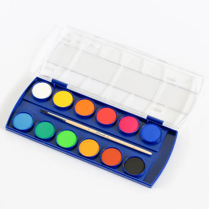 دارای 12 عدد قرص گرد همراه با یک عدد قلممو و یک عدد تیوپ رنگ سفید دارای کیفیت بالای رنگ رنگهای واضح و درخشان پوشانندگی عالی مقاوم در برابر نور و کمرنگ شدن قابل استفاده در مدارس و منزل ساخت کشور آلمان