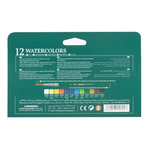 بستهبندی شیک و حرفهای «آبرنگ 12 رنگ آرتیست آریا» سبب شده این محصول به یک هدیه ارزشمند برای هنرمندان تبدیل شود. فراموش نکنید، کیفیت بالا و قیمت مناسب «آبرنگ 12 رنگ آرتیست آریا» آن را به یک رقیب اصلی برای نمونههای خارجی تبدیل کردهاست. زیرا این محصول نیز دارای نشان استاندارد اروپا بوده و کیفیتی جهانی را در اختیار شما قرار میدهد.